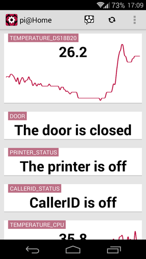 All the server-side software is written in python. The setup is the following. The raspberry pi is connected to the entrance door of my house, two doorbells, the intercom, a PIR of my home alarm system, and temperature sensor. It runs a server based on web.py. When a doorbell, intercom or door are triggered, the raspi saves the event to a sqlite database, and sends the event to the phone through GCM, where it’s received by my application and I’m notified. Also, when the door is opened, the raspi interrupts the circuit that connects the PIR to the home alarm. So, if the alarm is enabled, it detects the PIR as disconnected and is triggered. The server on the raspi monitors at regular intervals the cpu temperature and an external temperature sensor, saves the data to a sqlite db, and graphs the last 24 hours to an url-accessible image file.